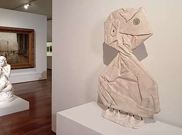 La vocation de Joan Miró pour la sculpture apparut tardivement, vers 1944, en pleine guerre mondiale. Et dès lors, il se livra avec passion à cet art, aussi poétique que sa peinture, mais plus provocant. Ce plâtre nous révèle le cœur de l’inspiration de Miró : son amour « franciscain » pour les choses ordinaires, comme par exemple le papier enveloppant un bonbon. Se laissant porter par son imagination associative, l’artiste le métamorphose en le tordant et en y ajoutant quelques coups de crayons feutre, jusqu’à ce qu’il prenne une forme humaine. Mais une forme humaine inquiétante, un « monstre vivant », un totem mêlant la moquerie et la terreur, que la blancheur du plâtre teint d’étrangeté.